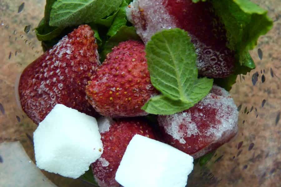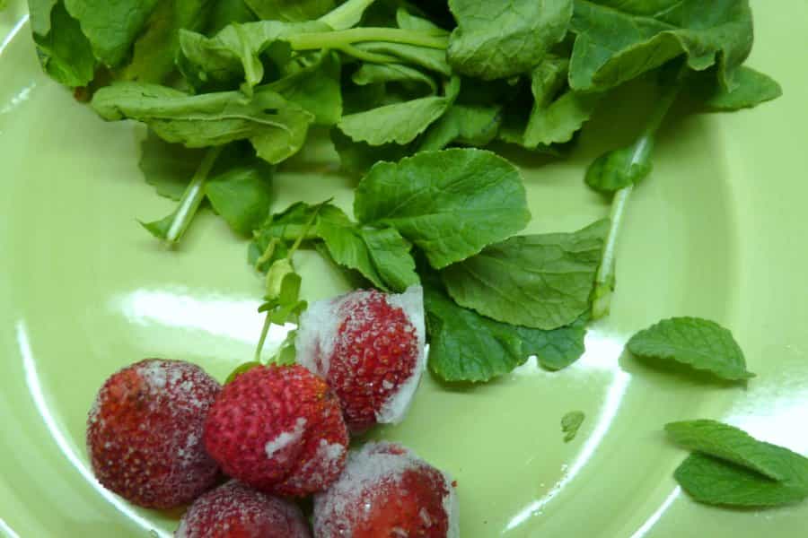 Ingredientes 1 taza de hojas de rábano ½ taza de frutillas 4 hojas de menta frescas 1 cucharada de azúcar Porciones 2 vasos grandes Preparación