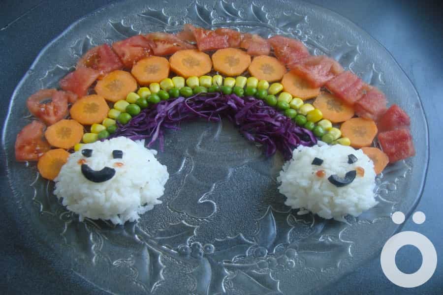 Primero colocar el repollo formando un arco entre las 2 nubes de arroz, luego colocar una corrida de arvejas, enseguida disponer los gramos de choclo y las rodajas de zanahoria, terminar con los trozos de tomate. Cortar trozos de aceituna, formar la boca y los ojos de las nubes de arroz. Al momento de servir sazonar a gusto. Los niños son felices con cosas sencillas, ya que saben apreciar la belleza oculta en cada cosa que ven. En el caso de este entretenido Arcoíris de verduras, haz que los más pequeños se sorprendan con una preparación única y divertida, capaz de derribar cualquier "mañosería" existente.