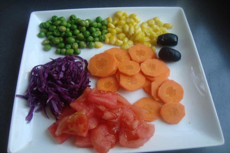 -1 taza de arroz -100 gramos de choclo en grano congelado -100 gramos de arvejas congeladas -2 zanahorias -2 tomates -3 hojas de repollo morado -4 aceitunas -Sal - Aceite Preparación Preparara el arroz: en un sartén con aceite de caliente saltear el arroz por 2 minutos, agregar 1 ½ taza de agua caliente, sazonar a gusto y revolver, cocinar tapado sobre el tostador por 15 minutos. Apagar y reservar. En una olla con agua caliente cocinar las arvejas y el choclo, por 15 minutos o hasta que estén blandos. Eliminar las durezas del repollo morado, picar en tiras, remojar en un pocillo con agua por 10 minutos. Escurrir las arvejas, los choclos y el repollo y reservar. Pelar la zanahoria y el tomate, cortar la zanahoria en rodajas, dividir las rodajas de tomate en 4 partes.