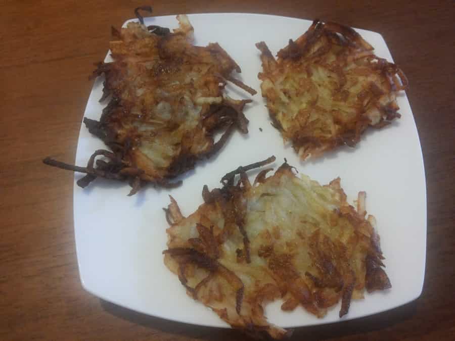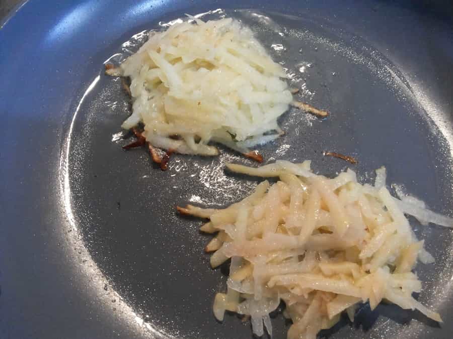 Pon aceite en una sartén y una vez caliente pon 2 cucharadas de papa rallada. Ve friéndolas poco a poco, hasta que estén doradas por ambos lados.}