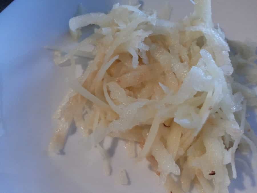 Preparación: Toma las papas y pélalas. Pásalas por el rallador por la parta más ancha.