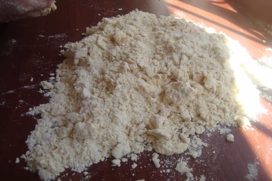 En un recipiente colocar la harina y mantequilla a temperatura ambiente, juntar con los dedos hasta formar una especie de migas, agregar las yemas (reservar las claras), la mitad de la leche y el pisco.