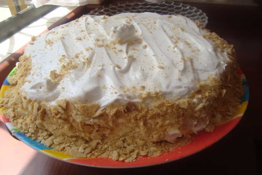 Cubrir los bordes y la parte superior de la torta con merengue, espolvorear el molido de hojarasca en el contorno de la torta y un poco en la superficie. Refrigerar, idealmente esta torta debe reposar por una noche antes de ser consumida.