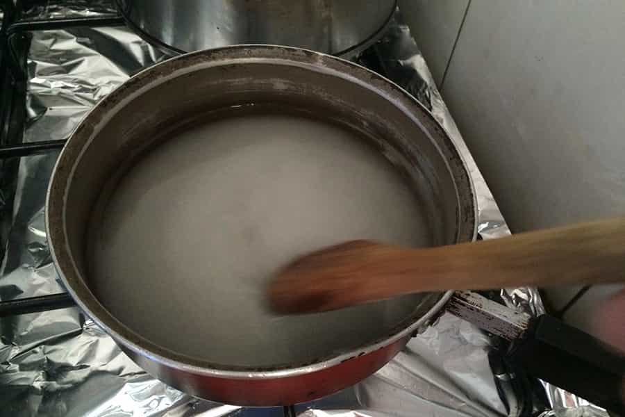 El almíbar es un jarabe que se utiliza mucho en repostería, ya que se le puede dar muchos usos. Uno de sus usos más populares es para mojar el bizcocho de las tortas, para que éste no quede seco. El almíbar se puede hacer sólo con azúcar o también con licores, como coñac, ron, entre otros. En este caso, prepararemos un almíbar de café, para que pueda ser usado en lo que quieran. Ingredientes: -1 taza de azúcar -1 taza de agua -2 cucharaditas de café instantáneo Preparación: Para nuestro almíbar lo primero que haremos es poner el azúcar y el agua en una olla o sartén alto a fuego medio. Iremos mezclando hasta que veamos que el azúcar comienza a disolverse. Para esto, es necesario revolver constantemente.