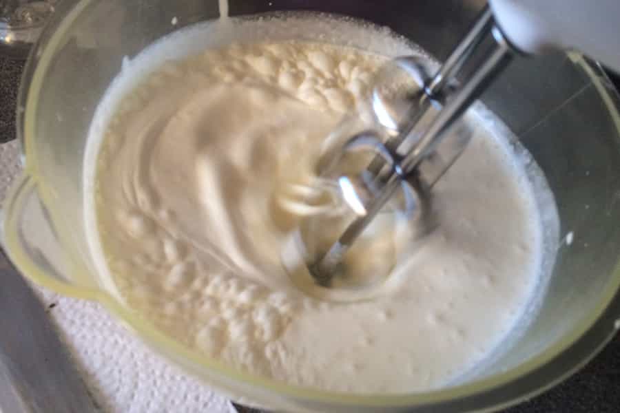 Nota: Si prefieren una mezcla lisa, entonces deben esperar a que el chocolate se enfríe y luego mezclarlo. Ahora debemos batir un poco nuestra crema para que logre consistencia y no la mezclemos cuando esté totalmente líquida. Ojo, no debemos batir en exceso, ya que después, al mezclarlo con el resto seguiremos batiendo y podríamos hacer que se nos corte la crema.
