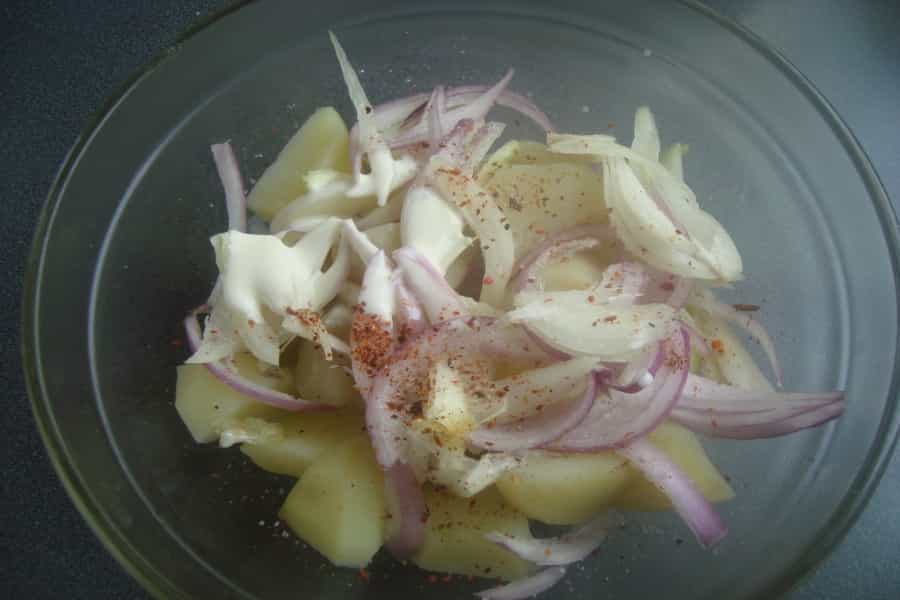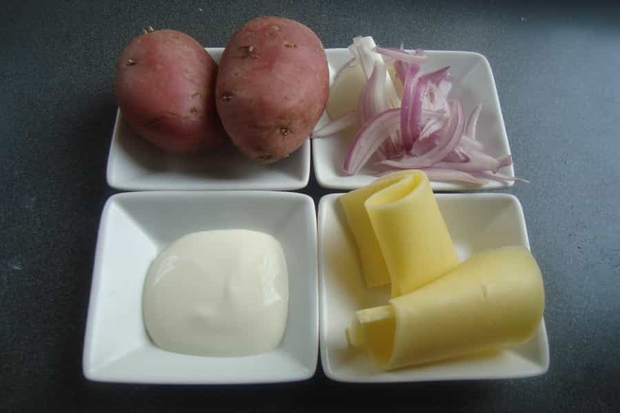 -½ kilo de papas peladas y cortadas en cubos -100 centímetros cúbicos (cc) de agua -2 cucharadas de cebolla cortada en pluma -½ cucharadita de sal -190 centímetros cúbicos (cc) de leche -190 gramos de queso crema -100 centímetros cúbicos de leche -2 láminas de queso -Sal - Merquén Preparación En un recipiente alto, apto para microondas colocar las papas y la cebolla, sal y una pizca de merquen.
