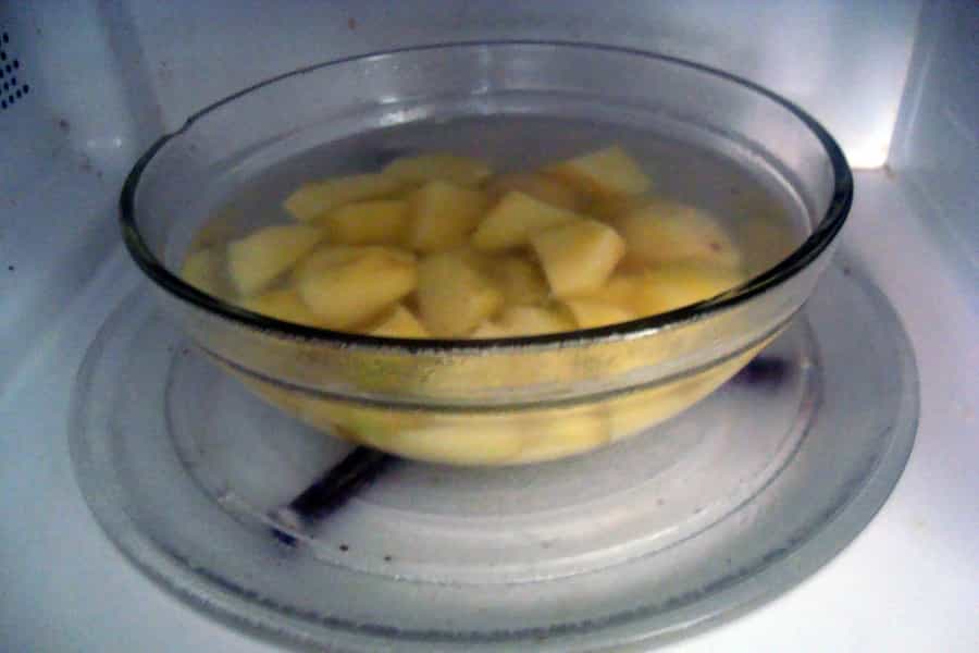 Tapar y cocinar en el microondas en potencia máxima (100%) por 10 minutos, una vez transcurrido el tiempo, revolver y volver a cocinar por 4 minutos a potencia máxima. En un recipiente mezclar la leche y la crema. Cuando las papas estén listas retirar el recipiente del microondas y verter la preparación de crema y leche sobre las papas, revolver y rectificar la sazón.