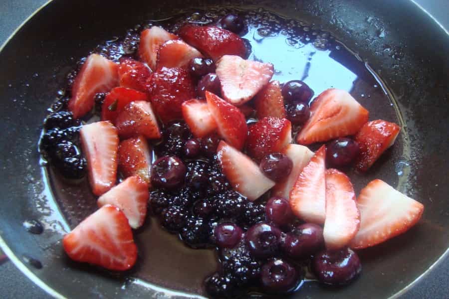 En una olla o sartén pequeño colocar 4 cucharadas de azúcar, agregar 50 mililitros (ml) de agua, revolver, cuando comience a hervir agregar el mix de berries, revolver suavemente, cocinar por 2 minutos a fuego bajo, apagar y enfriar.