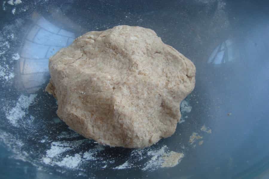 -300 gramos de harina integral -150 gramos de harina sin polvos de hornear -2 cucharaditas de sal -2 cucharadas de levadura en polvo -2 cucharadas de aceite de oliva -1 ¼ taza de agua tibia Preparación En un recipiente mezclar las harinas, sal y levadura. En el centro agregar el aceite, con ayuda de una cuchara de madera revolver, incorporar el agua tibia en pequeñas cantidades, amasar hasta conseguir una masa homogénea.