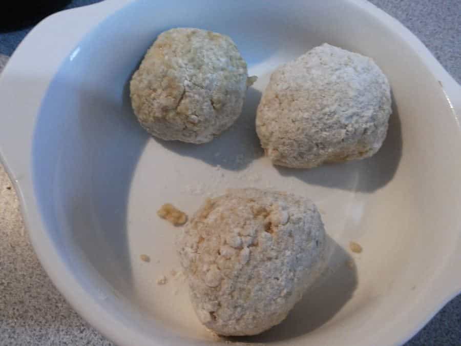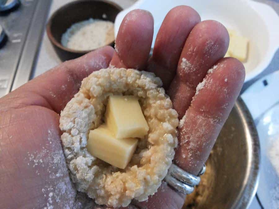 Pon a precalentar el horno a 150°C por 15 minutos. Una vez mezclados los ingredientes, toma la ve haciendo bolitas del tamaño de la mano o más pequeñas, pásalas por la harina para que no se peguen de la mano. Has un hoyito en el medio y coloca el queso. Ciérralas.