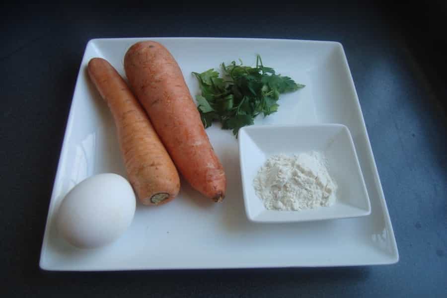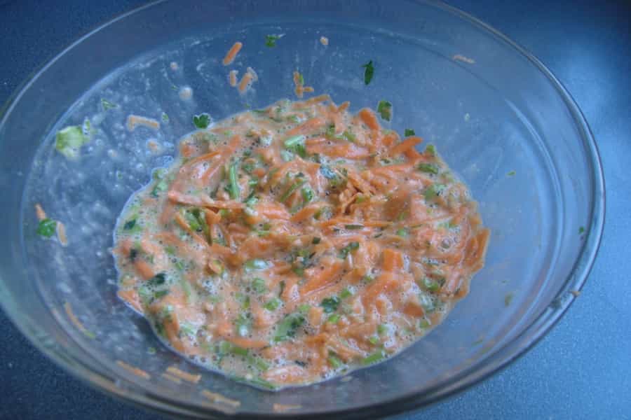 -3 zanahorias medianas -2 huevos -2 cucharadas de perejil picado -1 cucharada de harina -Sal -Aceite Preparación En un pocillo pequeño batir los huevos, reservar. Pelar y rallar las zanahorias en tiras. En un recipiente mezclar las zanahorias ralladas, el perejil picado y sal a gusto. Incorporar los huevos batidos a la mezcla de zanahoria con cilantro, revolver. Agregar la harina e integrar.