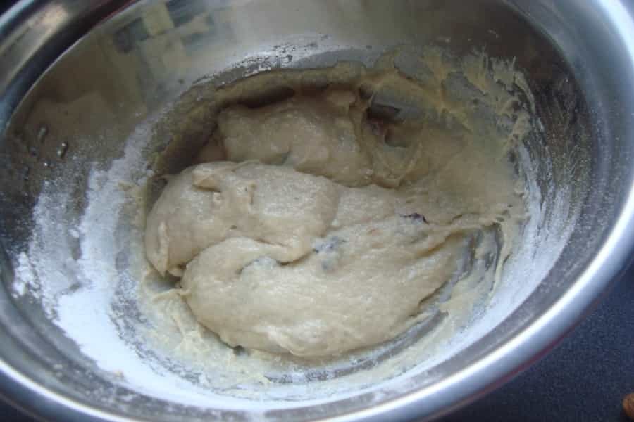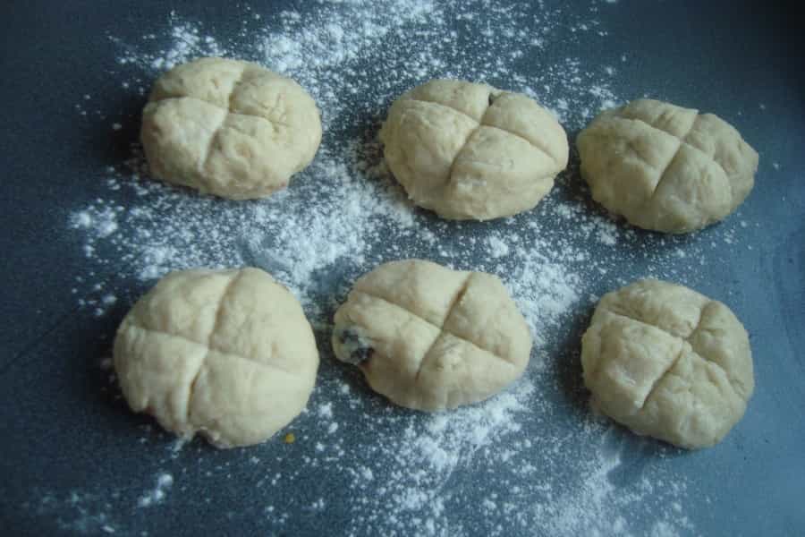 Una vez lista la masa incorporar las pasas escurridas, sin nada de liquido y las almendras picadas. Dejar reposar la masa tapada, en un lugar tibio por 30 minutos. Transcurrido el tiempo cortar la masa en 12 trozos. Formar bollos y dejarlos reposar en un lugar cálido por 30 minutos. Hacer un corte en cruz encima de los panes.