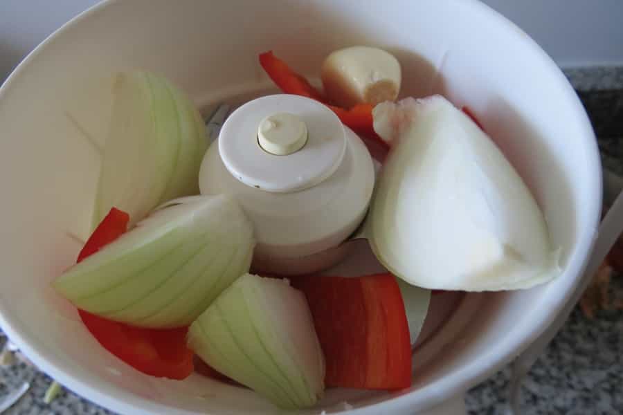 Colocarla en un sartén para cocinarla con un poquito de agua, a medida que esté lista, agregar sal al gusto. Colocar los vegetales en el picatodo, o picarlos de forma manual en trozos muy pequeños, igualmente la parte interna de la berenjena.