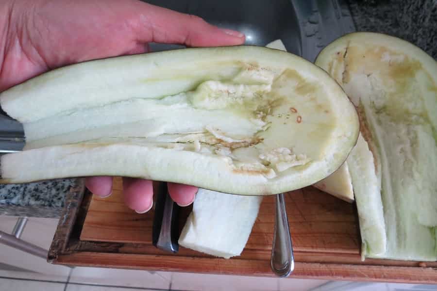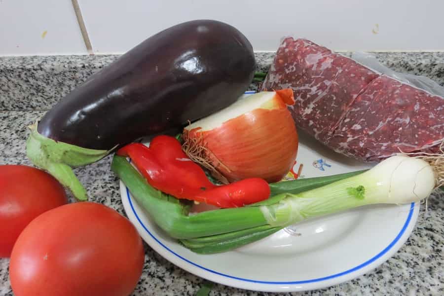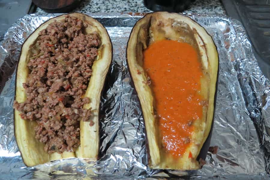 Preparación de la carne: Cortar la berenjena a lo largo, y sacar la parte interna de manera que quede como una canoa, reservar el relleno para utilizarlo en la preparación de la carne.