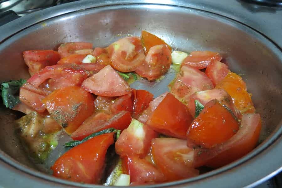 Preparación de la salsa: Colocar un chorrito de aceite de oliva en un sartén con fuego medio, cortar los tomates en cuadros medianos, los dientes de ajo en trocitos y agregarlos al aceite caliente junto a las especies y condimentos, revolver muy bien y luego tapar para dejar cocinar y bajar la llama.