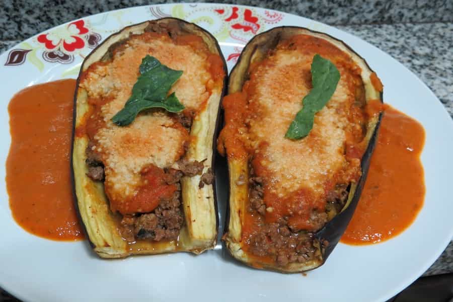 A los cinco minutos, agregar la sal y el azúcar, ya debe estar hecha una pasta, dejar cocinar por cinco minutos más. Luego dejar reposar e introducir a la juguera para volverlo salsa. Mientras se cocina la salsa, se debe colocar aceite de oliva en la parte interna de las dos mitades de berenjenas e introducirlas al horno en 200° durante 20 minutos. Cuando esté lista la carne, la salsa y la berenjena esté cocida, se procede a rellenar. Primero con una capa de salsa y luego con carne, después se coloca el queso parmesano.