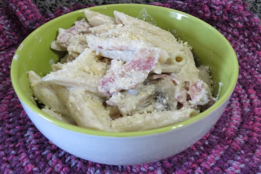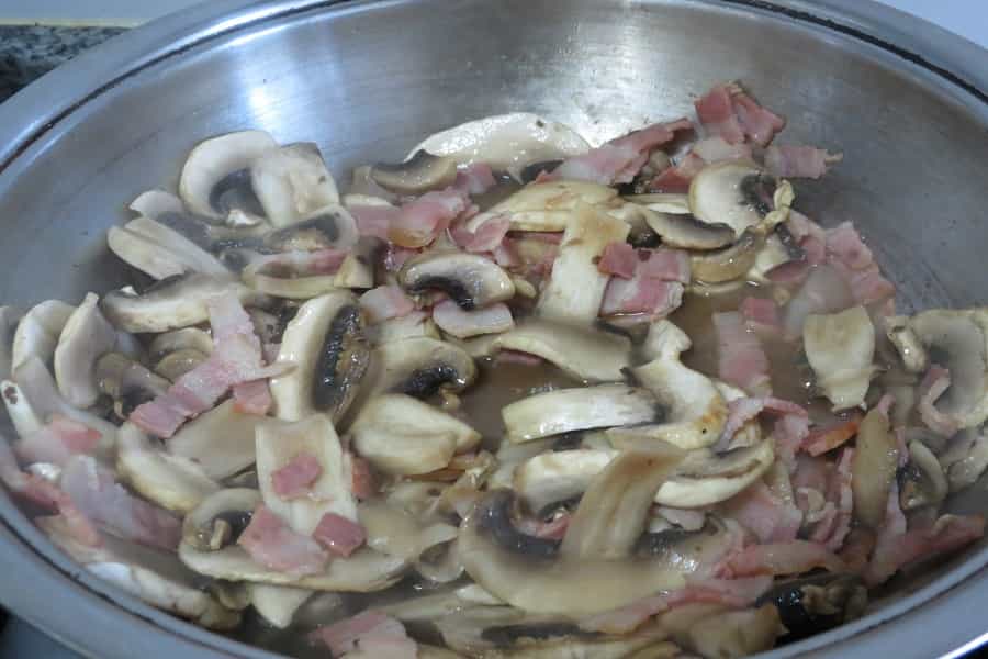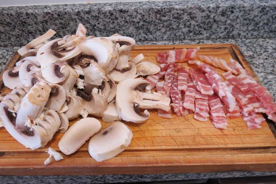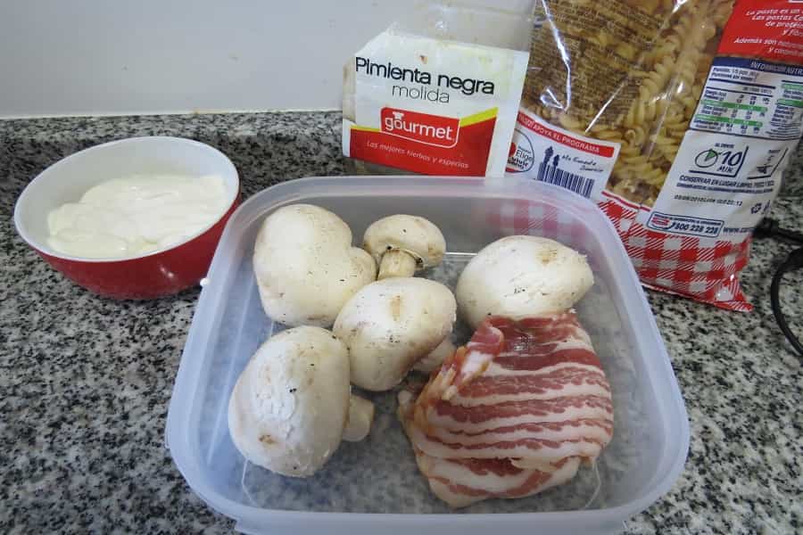 Preparación: Poner agua a hervir para preparar la pasta. Una vez que esté hirviendo, agregar sal al gusto y la pasta, revolver muy bien para que no se peguen. Mientras hierve el agua, se cortan los champiñones en rodajas y la panceta en cuadritos.