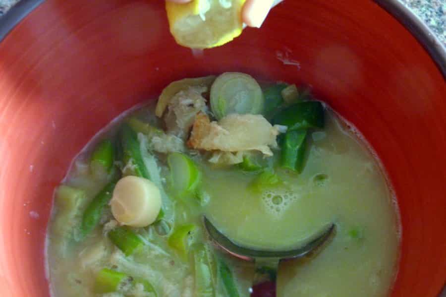 Servir caliente acompañada de unas gotas de limón exprimidas justo al momento de comer. Esta exquisita sopa picante de jaiba y coco es excelente para revivir el cuerpo y los sentidos.
