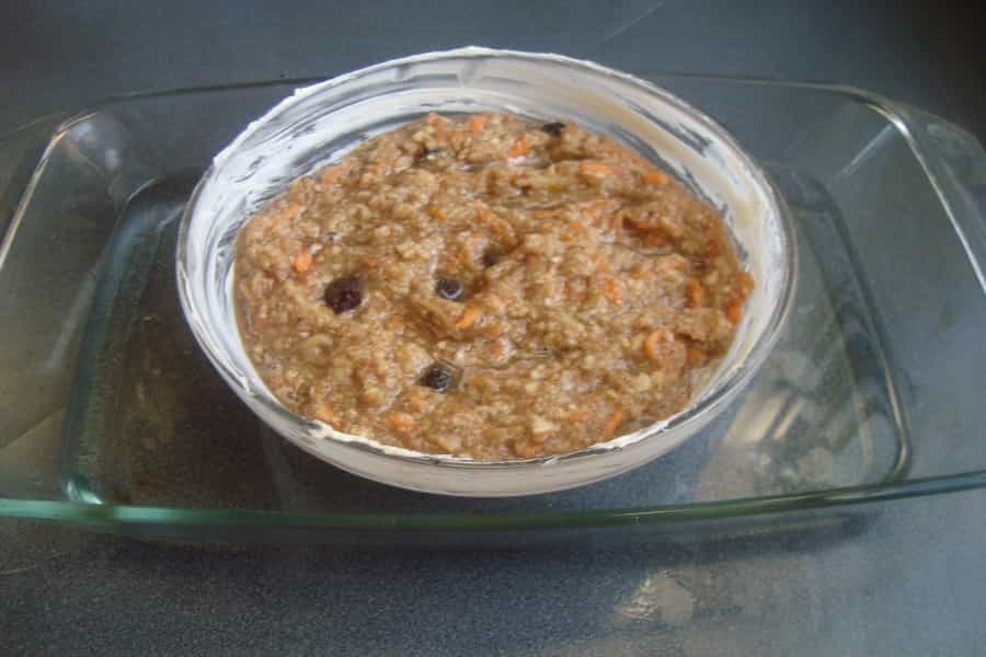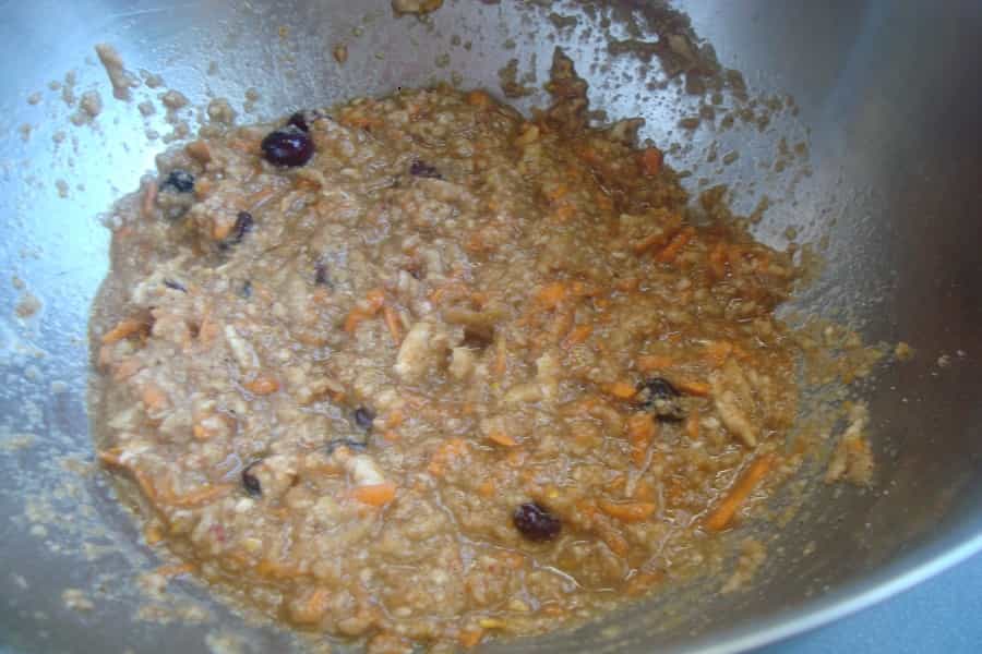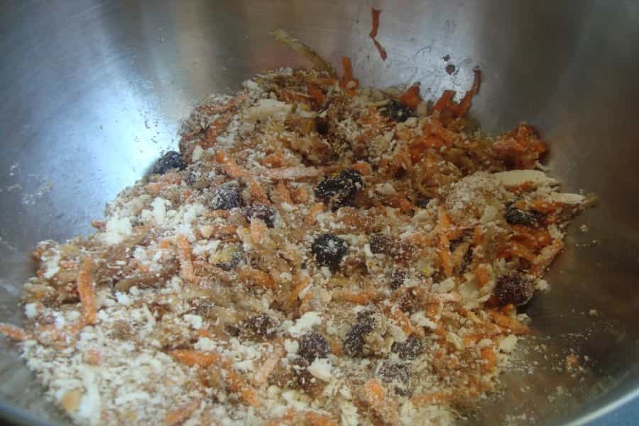 Preparación En un recipiente mezclar: pasas, pan molido, azúcar morena, zanahoria rallada, manzana rallada, nueces picadas, almendras picadas, fruta confitada, cerezas, mantequilla derretida, ralladuras, especies, harina y una pizca de sal.