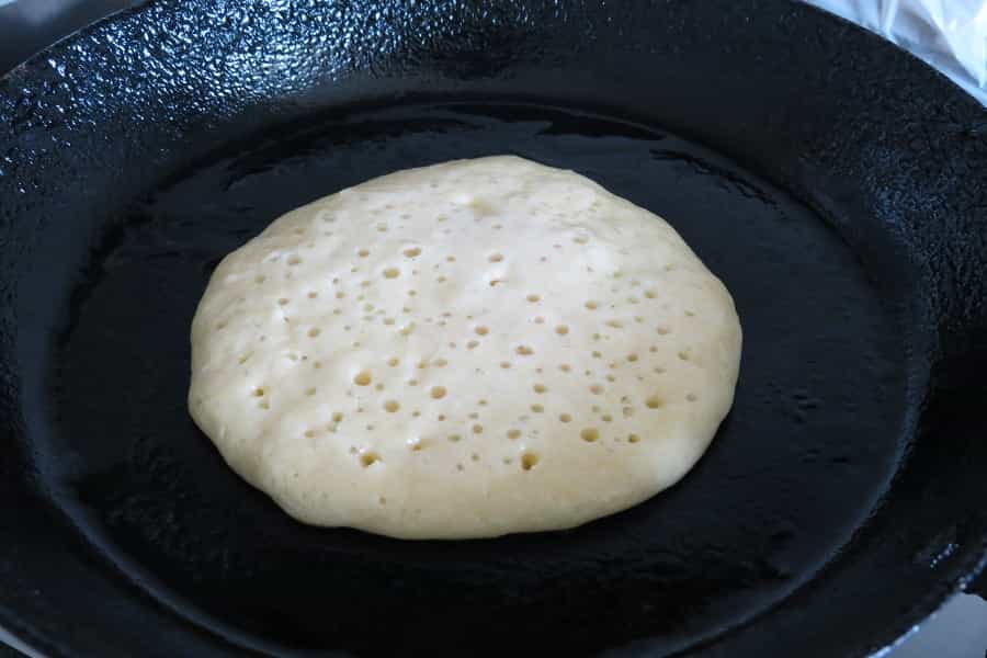 Poner a calentar el sartén de teflón a temperatura media y colocar una fina capa de aceite para que no se pegue, servir con un cucharón la medida de su gusto, cuando salgan burbujas, la puedes voltear.