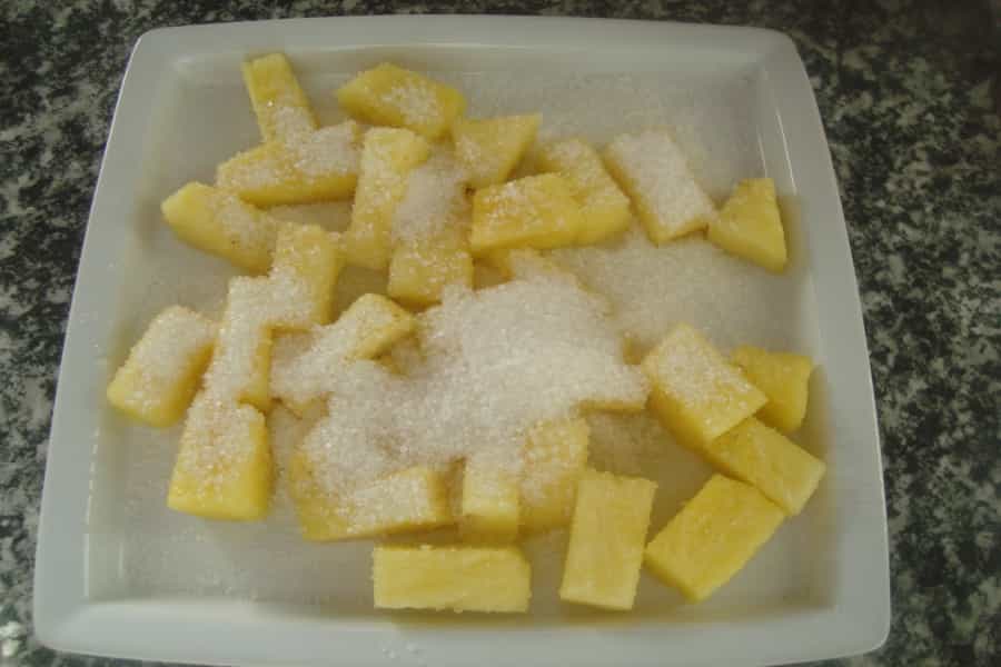 -1 botella de vino -½ taza de azúcar -500 gramos de fruta fresca o 1 tarro de frutas (piña, duraznos, chirimoya, guinda, frutilla) Preparación En un plato macerar la fruta, para esto picar la fruta y esparcir azúcar sobre ella, dejar reposar por 1 hora en el refrigerador.