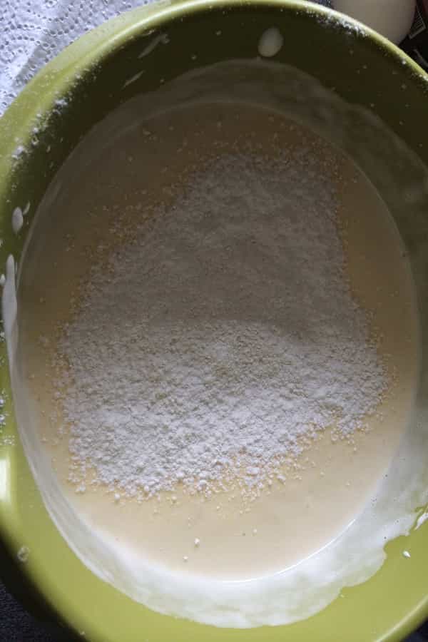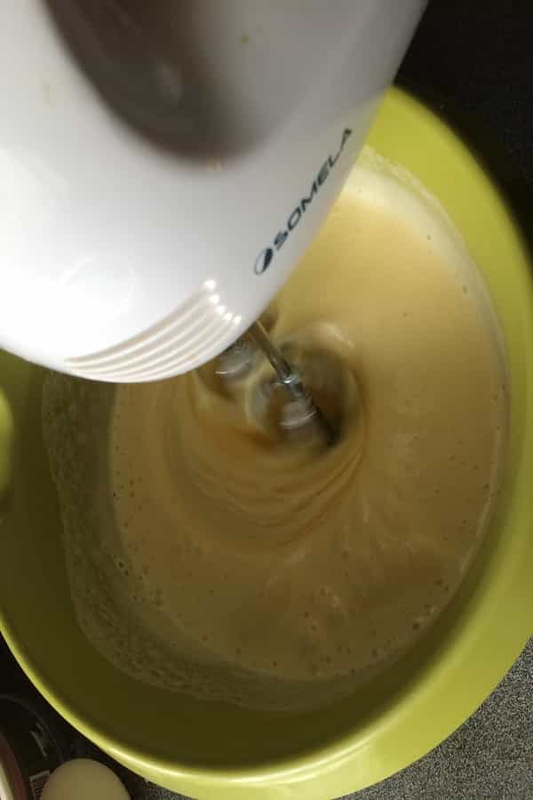 Cuando lleven unos 4 minutos batiendo añadirán el azúcar en 3 tandas. Seguirán batiendo por unos 10 minutos más. Es importante que batan hasta que suba mucho y se vuelva una mezcla blanca y aireada. Debe quedar a punto letra, es decir, que si hacen una letra ésta no se disuelva antes de 5 segundos.