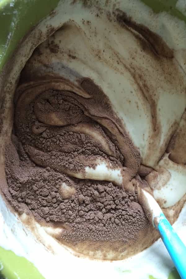 Luego añadimos el chocolate de igual manera, tamizado y uniéndolo de forma envolvente.