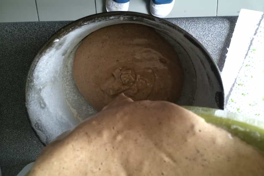 Una vez que hayamos logrado unir todo y veamos que ya no quedan grumos, pondremos la mezcla en un recipiente de 24 o 26 centímetros que esté enharinado y metemos al horno.