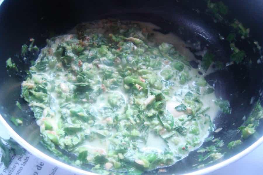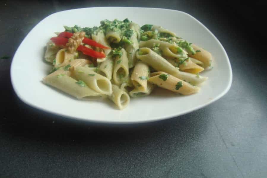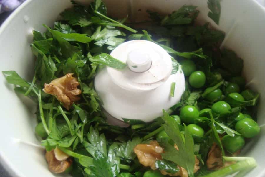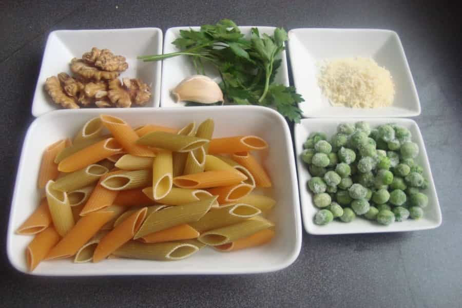 -2 tazas de arvejas congeladas -1 taza de perejil -100 gramos de queso rallado -2 cucharadas de queso rallado -1 diente de ajo -400 gramos de pasta -50 gramos de nueces -1/3 taza de aceite de oliva -Sal - Pimienta Preparación En una olla con abundante agua caliente cocinar las arvejas hasta que estén blandas. Escurrir y reservar.En una procesadora poner 1 taza de arvejas cocidas, perejil, nueces, queso rallado, ajo y 1 cucharada de agua.
