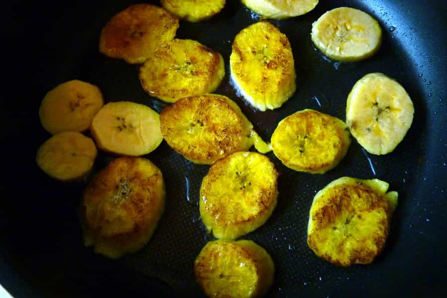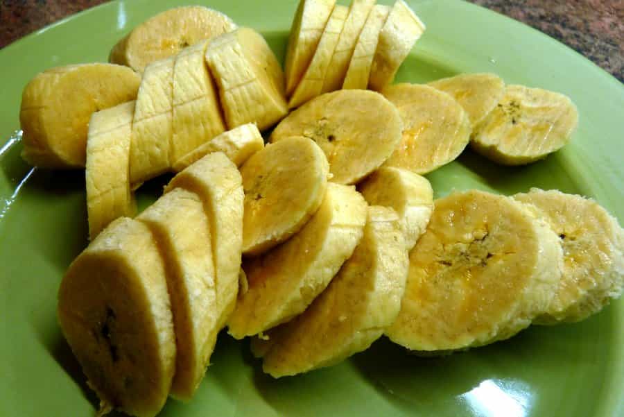Corta las puntas y quita la cáscara de los plátanos. Córtalo en rebanadas de alrededor de ½ cm de grosor. También puedes optar por cortar el plátano a lo largo.