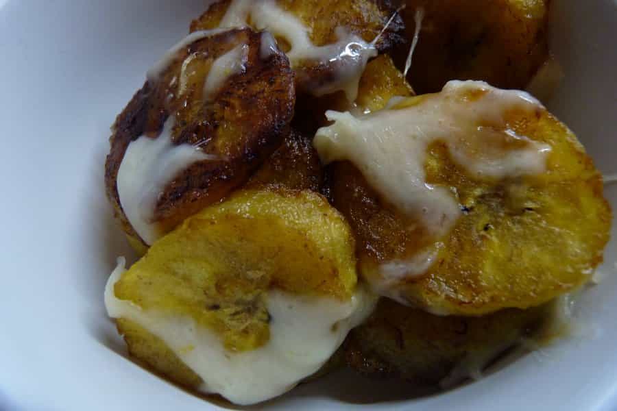 Los plátanos fritos son una receta tradicional de los lugares tropicales del mundo y especialmente de nuestro continente. Una receta especialmente querida por los habitantes de los países tropicales de Sudamérica son los plátanos fritos con queso. Antes de pasar a la receta, veremos ciertos aspectos a considerar al momento de realizar esta preparación. Los plátanos que debes usar para esta receta son los llamados plátanos machos, plátanos verdes o para cocer, su nombre científico es musa paradisiaca. Es importante diferenciar este tipo de plátanos del plátano común. Para esta receta lo ideal es usar plátanos verdes bien maduros. Puedes saber cuándo uno de estos plátanos está maduro por el color de su cáscara. Mientras más negra se ponga por todos lados, mejores son las probabilidades de que el plátano esté maduro. Son varios los tipos de queso que puedes usar para preparar estos plátanos. Quesillo, queso fresco, mozzarella, feta, mantecoso, etc. La verdad es que puedes usar el que más te guste. Opte por el mantecoso porque en mi opinión es el más rico derretido.