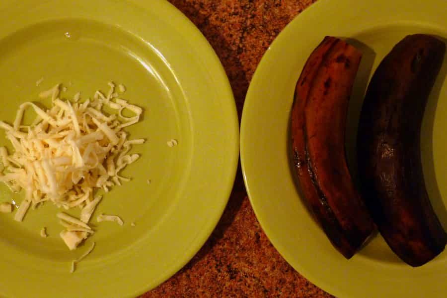 Ingredientes 2 plátanos verdes maduros 2 cucharadas de aceite ½ taza de queso mantecoso rallado Porciones 2 porciones Preparación