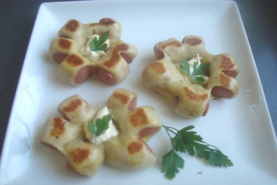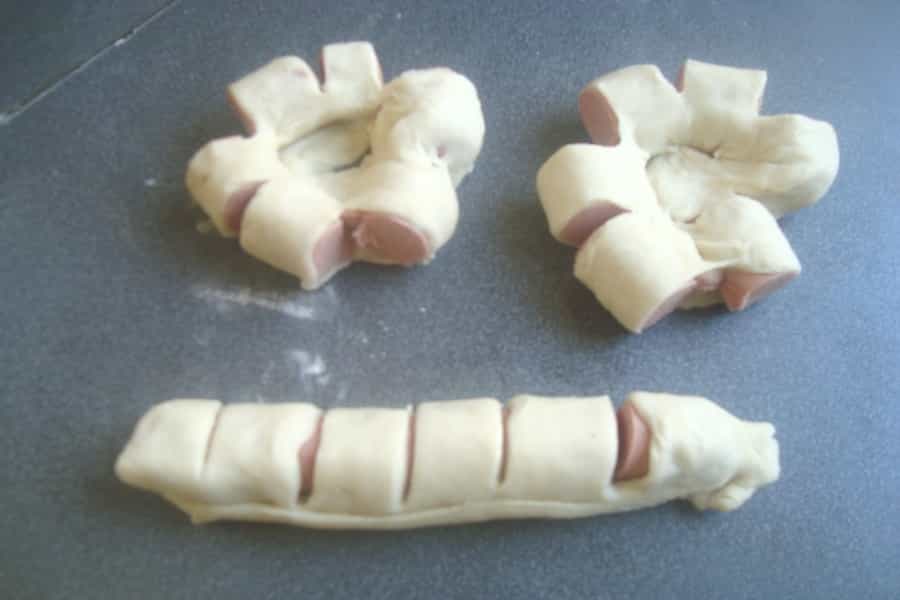 Cubrir la masa con un paño limpio y dejar reposar en un lugar tibio por 30 minutos. Transcurrido el tiempo de reposo, extender la masa en una mesa enharinada, cortar rectángulos y envolver las vienesas. Hacer 5 cortes cuidando de no cortar totalmente. Unir los extremos y formar una flor.