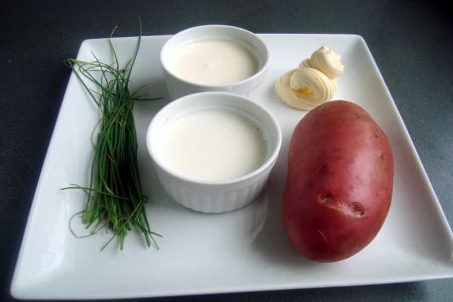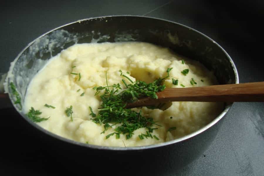 Antes de que se enfríe colocar el puré en una olla con una cucharada de margarina, batir con fuerza sobre el fuego añadiendo de a poco la leche caliente hasta que el puré quede con una consistencia liviana y cremosa, finalmente agregar la crema y el ciboulette picado.