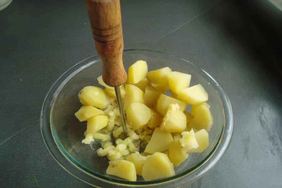 Cuando las papas estén cocidas, estilar y molerlas hasta formar un puré.