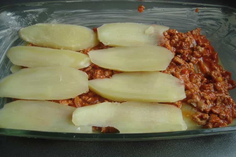Sobre ellas colocar una porción de pino de carne, luego otra capa de papas y así hasta terminar con una capa de papas. Por último bañar con la salsa preparada y espolvorear queso rallado.