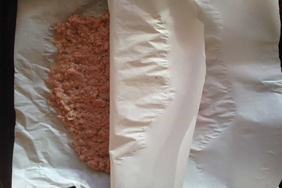 Luego cortaremos dos pedazos de papel mantequilla del porte de la bandeja del horno. Pones la masa sobre un papel y la cubres con el otro papel. Con uslero comienzas a expandir la masa. Debes tener cuidado de que no quede muy delgada. Con estos ingredientes dos personas podrían comer tranquilamente.