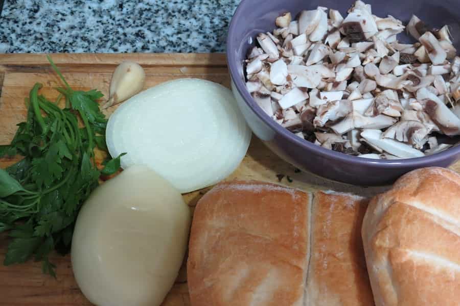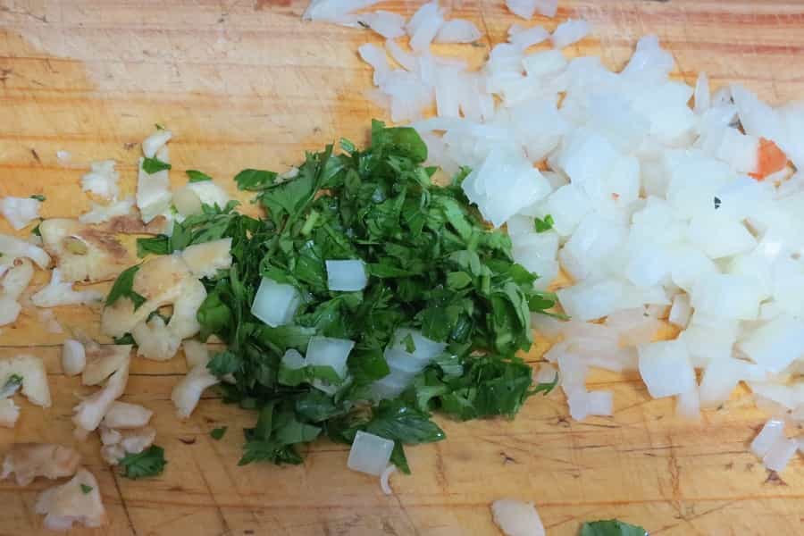 Cortar el cuadritos el perejil, la cebolla y el champiñón, machacar el ajo.