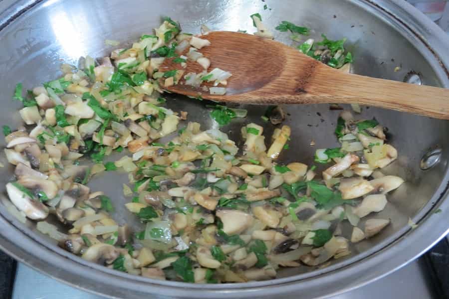 Poner a sofreir la cebolla y el ajo en un sartén con un chorrito de aceite de oliva durante 4 minutos, agregar después los champiñones y dejar 4 minutos más, agregar el perejil y dejar durante 1 minuto más.