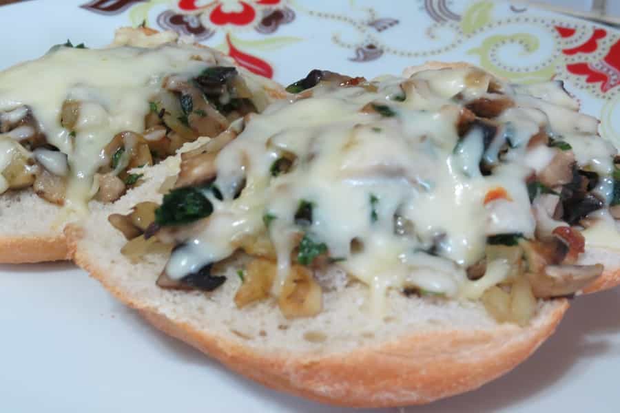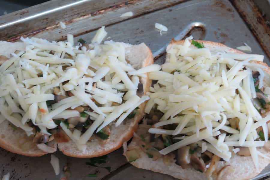 Una vez listo abrir el pan en dos partes y colocar la mezcla sobre las rebanadas de pan. Rallar el queso mozarella y colocarlo encima.