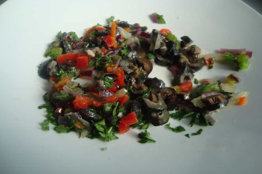 En una fuente o un plato mezclar las aceitunas sin carozo y picadas en cuartos, el pimentón picado en cubos pequeños, la cebolla cortada en cubos y el perejil fresco picado, agregar jugo de limón, aceite de oliva, sal y merquén a gusto. Revolver hasta integrar totalmente.