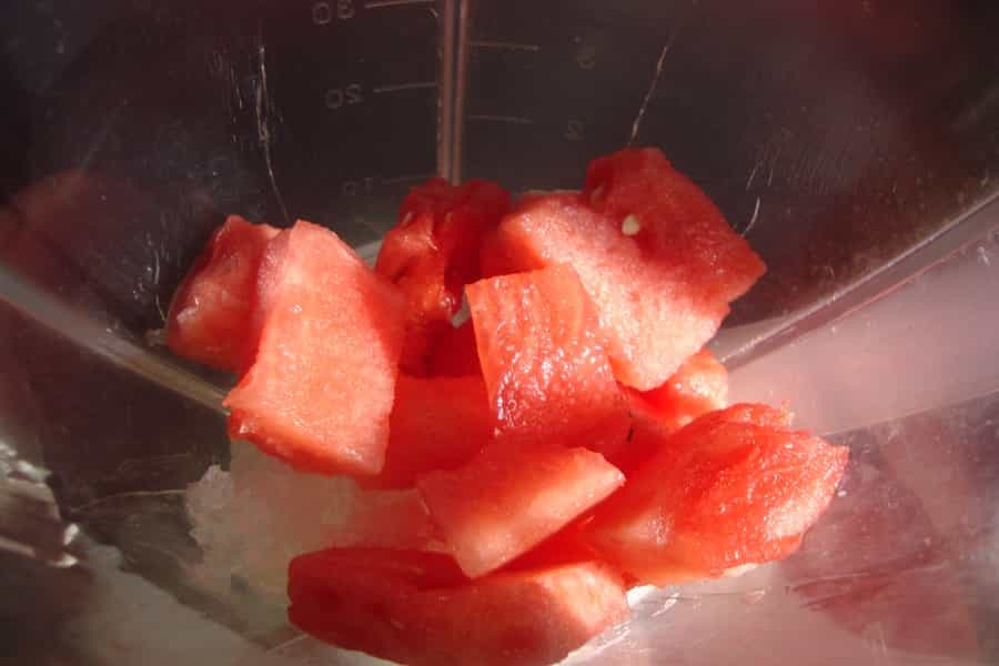 En una procesadora o una juguera colocar ¼ taza de cubos de hielo y la sandia, moler por 15 segundos.