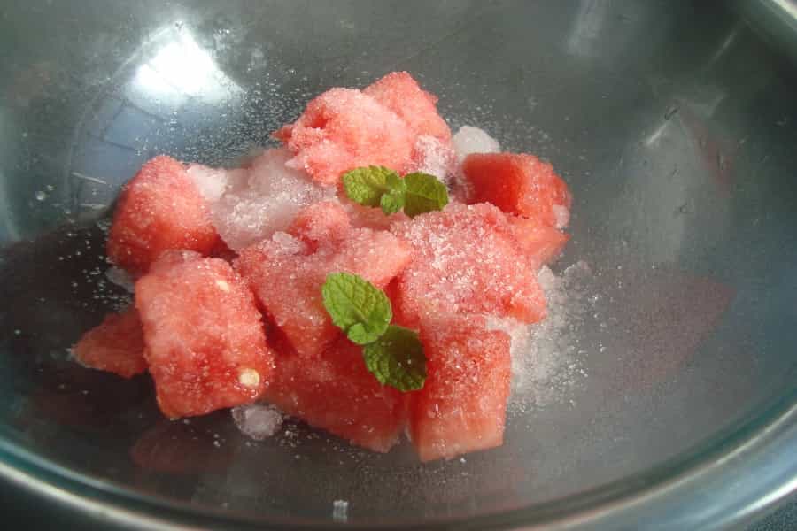 Colocar los cubos de sandia en un plato y llevar al congelador por 4 a 5 horas.