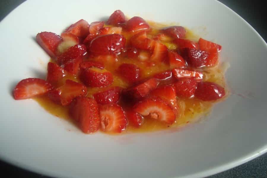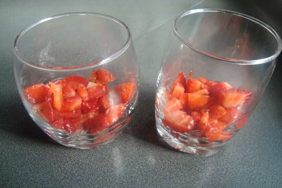 Picar 1/2 taza de frutillas y distribuirlas en pocillos o vasos, verter la espuma de mango y frutillas.