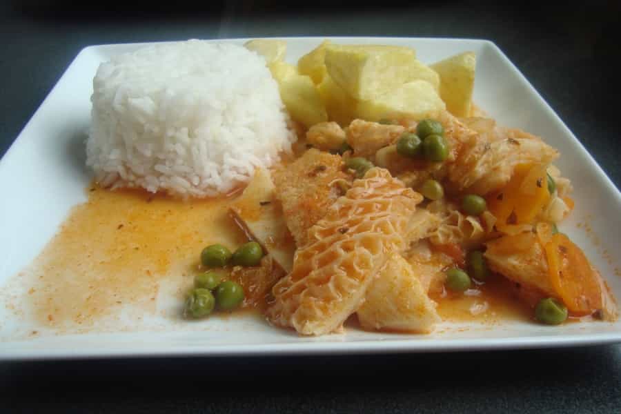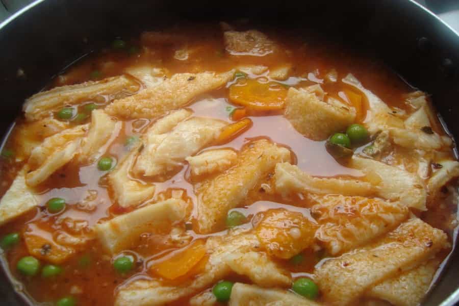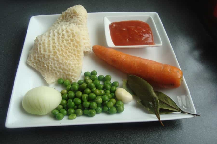 En un olla sofreír por 2 minutos la cebolla picada en juliana, añadir el ajo, luego la salsa de tomate, añadir una pizca de azúcar, las zanahorias cortadas en rodajas, el laurel y las arvejas cocidas, cocinar por 3 minutos a fuego medio.