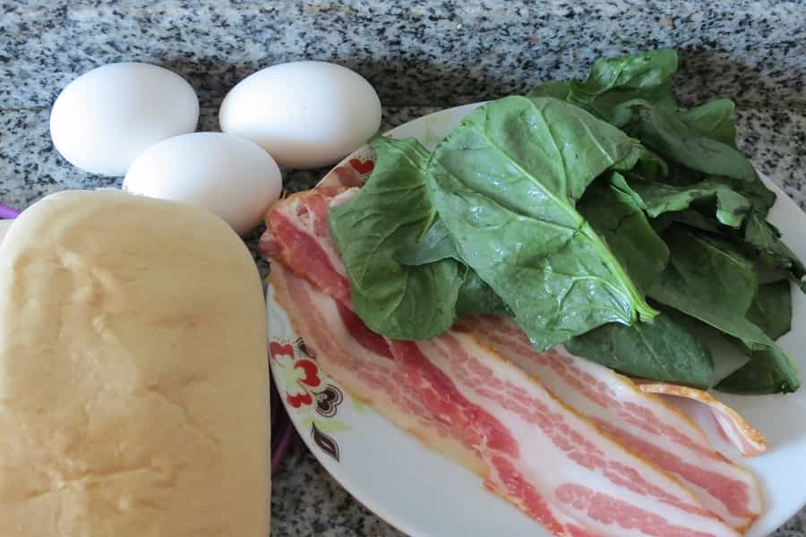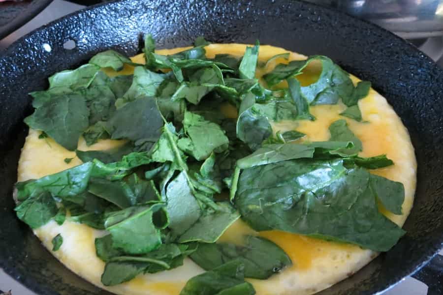 Por otro lado, bate lo huevos y colócalos en una sartén tipo tortilla, agrega sal y cundo estén a punto de cocción, agrega el puñado de espinacas, tápalo y déjalo cocinar un minuto