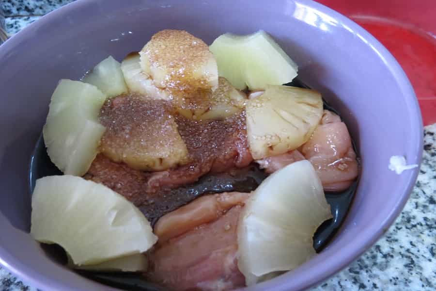Mezclar la salsa soja, vinagre y azúcar, añadir el pollo y la piña cortada en trozos del mismo tamaño aprox del pollo. Dejar marinar dos horas en la nevera y revolver constantemente. No dejar de una noche a otra porque la piña podría dañarse.
