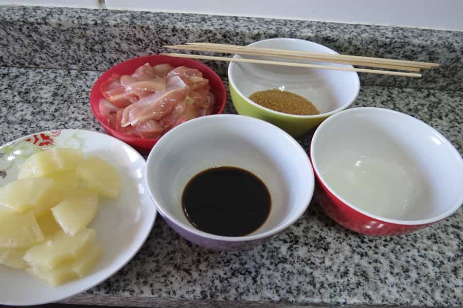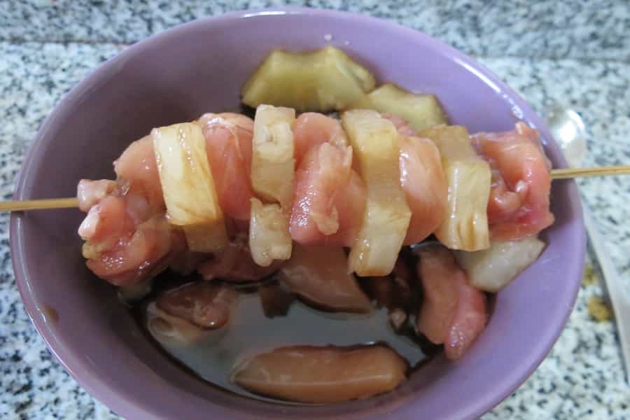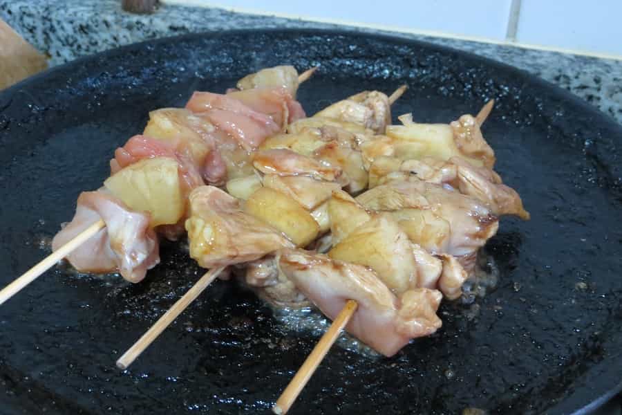 Colocar una sartén a fuego medio alto con un poco de aceite, sólo para que no se peguen los anticuchos. Introducir los trozos de pollo y piña en los palitos, alternando pollo y piña.