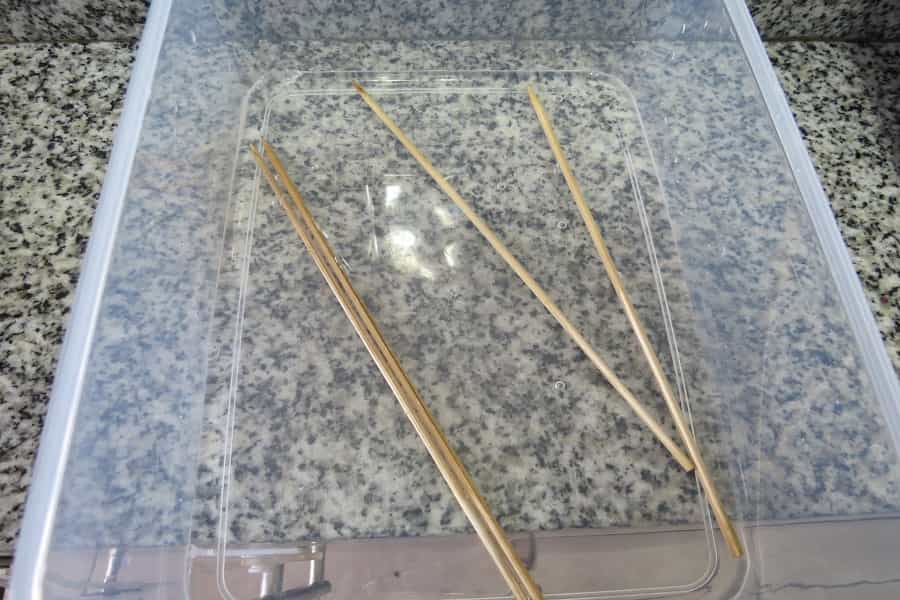 Colocar los palitos en agua para remojar durante 1 minutos para que no se quemen