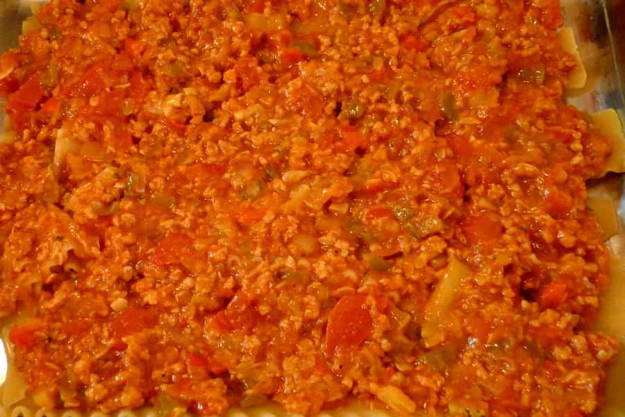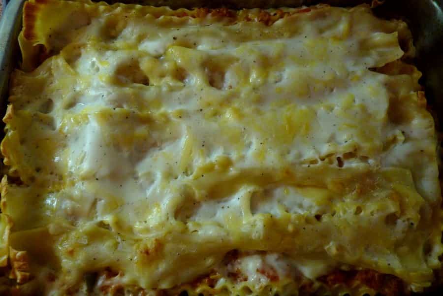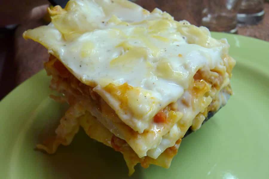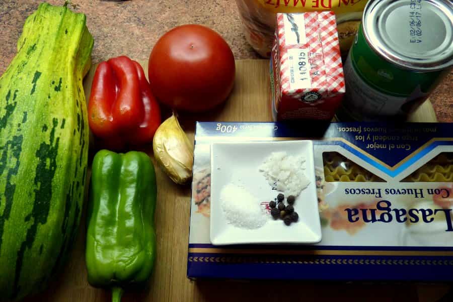 Cuece las láminas de lasaña en abundante agua por 7 minutos. Enmantequilla una fuente para el horno. Pon una base de láminas de lasaña, luego agrega una capa de salsa de vegetales. Luego otra capa de láminas y encima de esta agrega salsa blanca y queso masdam rallado. Continúa con las capas hasta que se acaben los ingredientes.